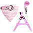 - Leash Length: 39 inches. Harness and Leash Material: Nylon + Stainless Closp, Bandana Collar Material: Synthetic Leather and Cotton